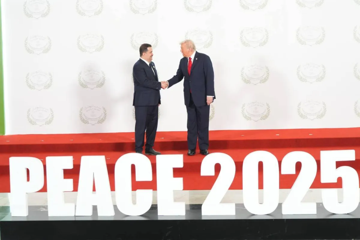 رئیس‌جمهور آمریکا، دونالد ترامپ، و نخست‌وزیر عراق، محمد شیاع السودانی، در عکس یادگاری حاشیه اجلاس شرم‌الشیخ، ۱۳ اکتبر ۲۰۲۵ (رسانه دولتی)