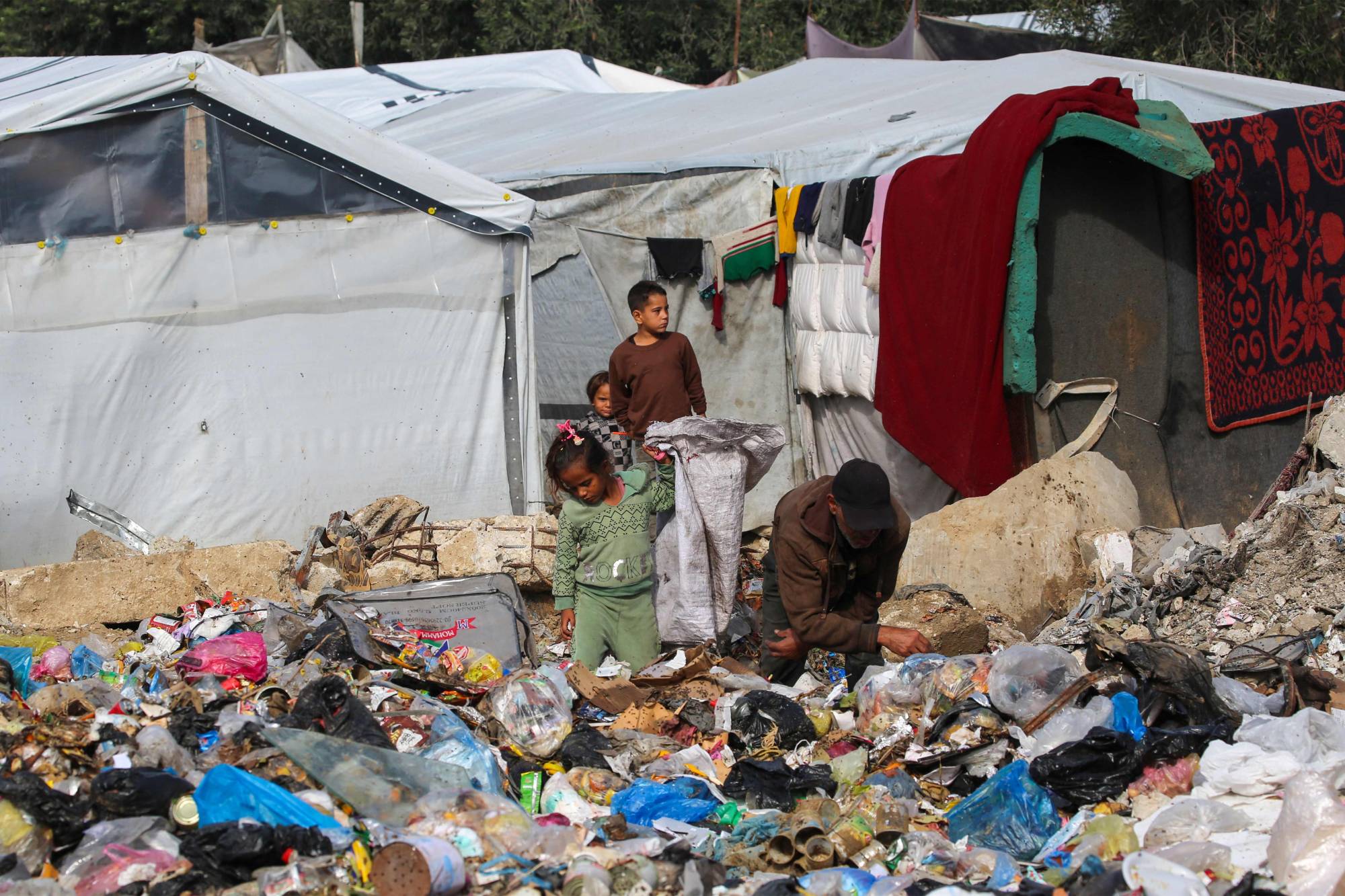 فلسطینی‌ها در اردوگاه النصیرات در وسط غزه در حال جستجو در میان زباله‌ها برای یافتن هر چیزی که قابل استفاده باشد (AFP)